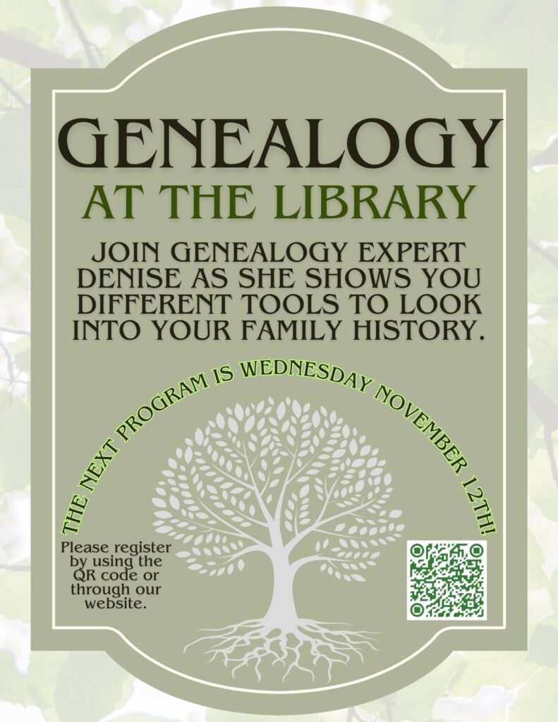 GENEALOGY AT THE LIBRARY – 2nd Wednesday of the month from 1-3 PM.