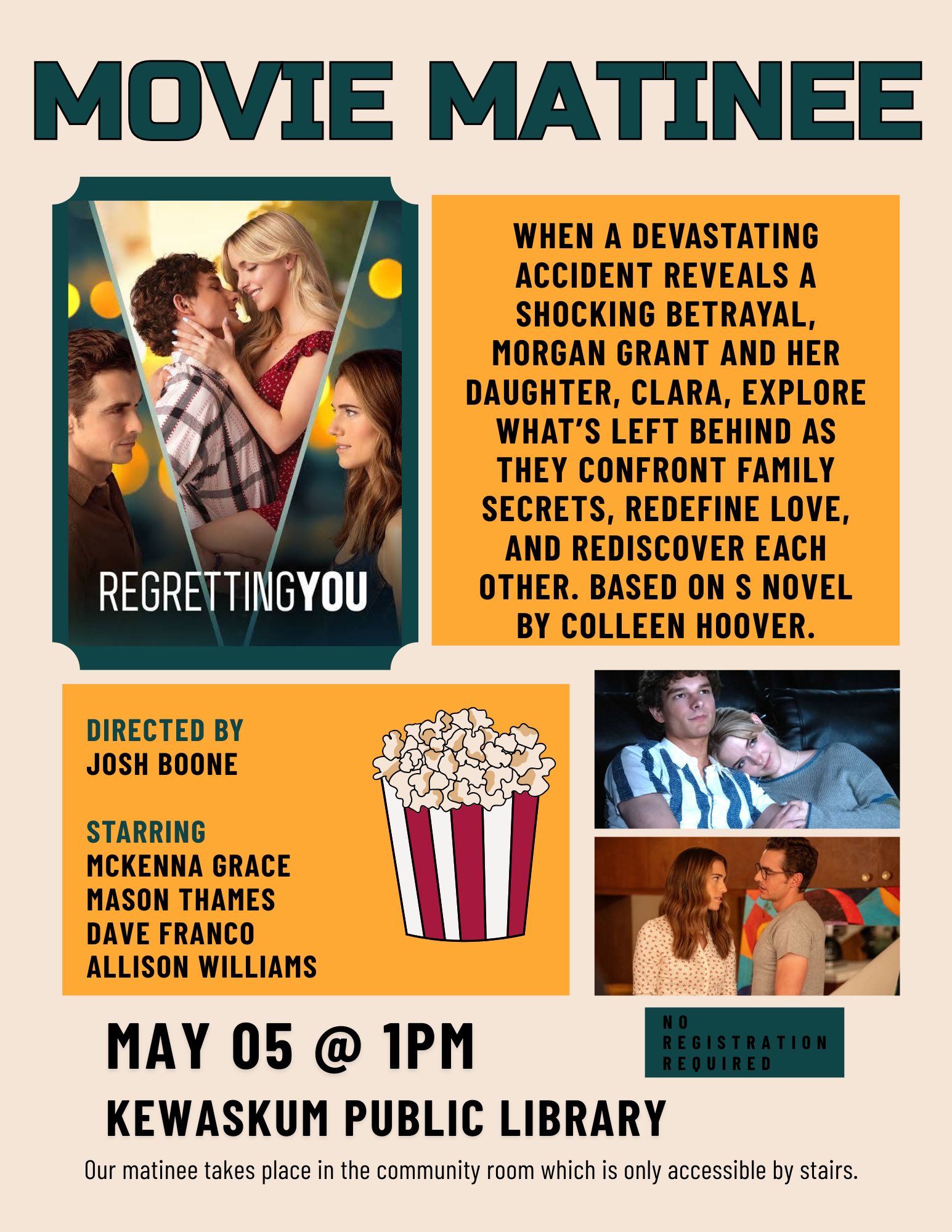 Recently released or popular films will be shown free of charge in our Community Room. Free popcorn will be served.