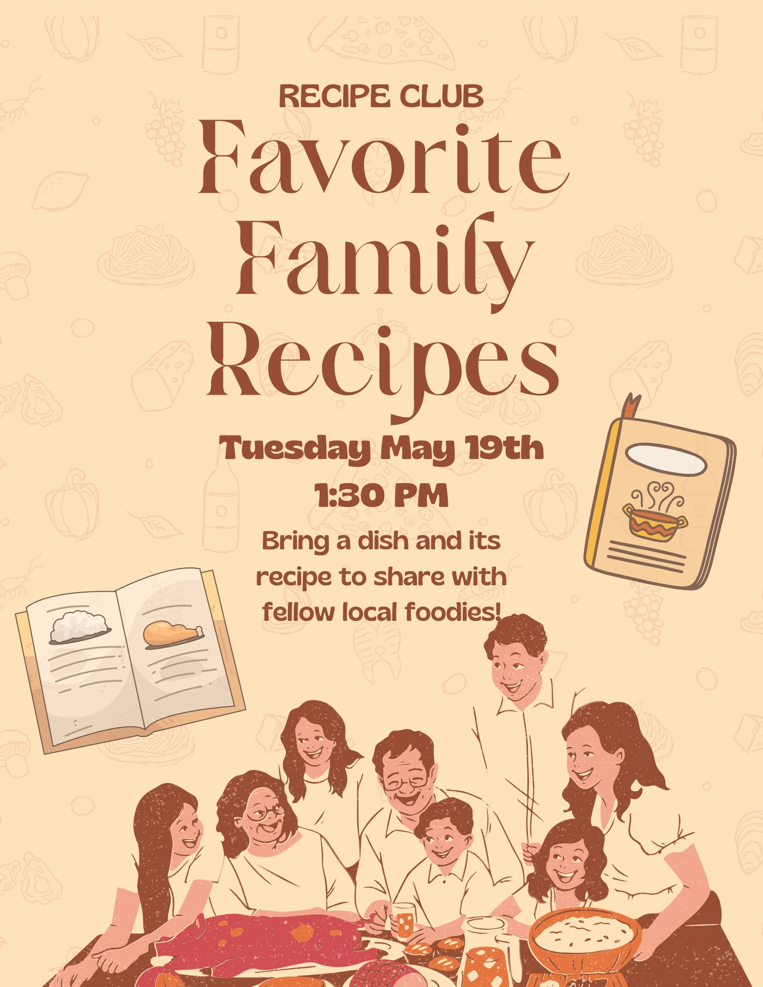 Bring your ready-to-eat dish and printed recipe. Paper products, utensils and water will be provided.