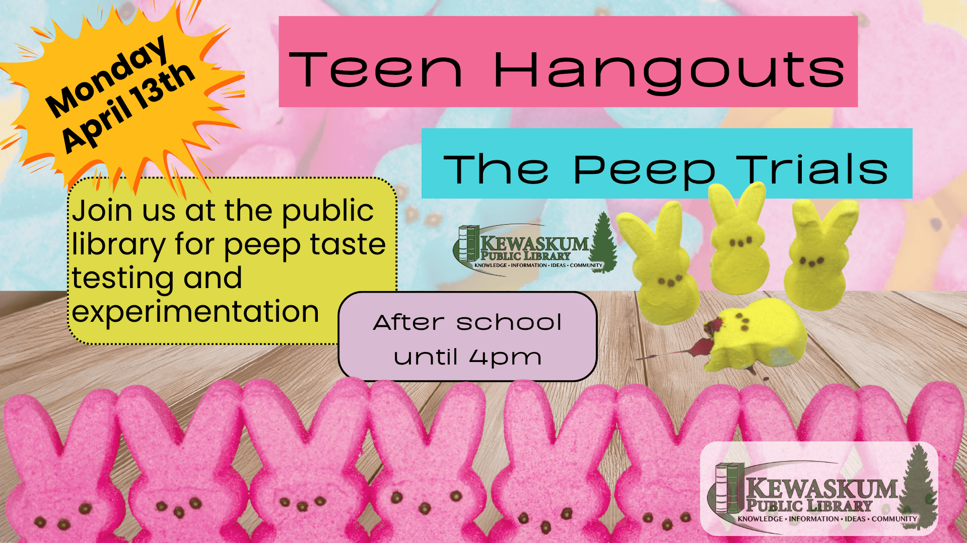 4/13: The Peep Trials – Join us for peep taste testing! Can you guess the flavors? Which is best and which is worst?